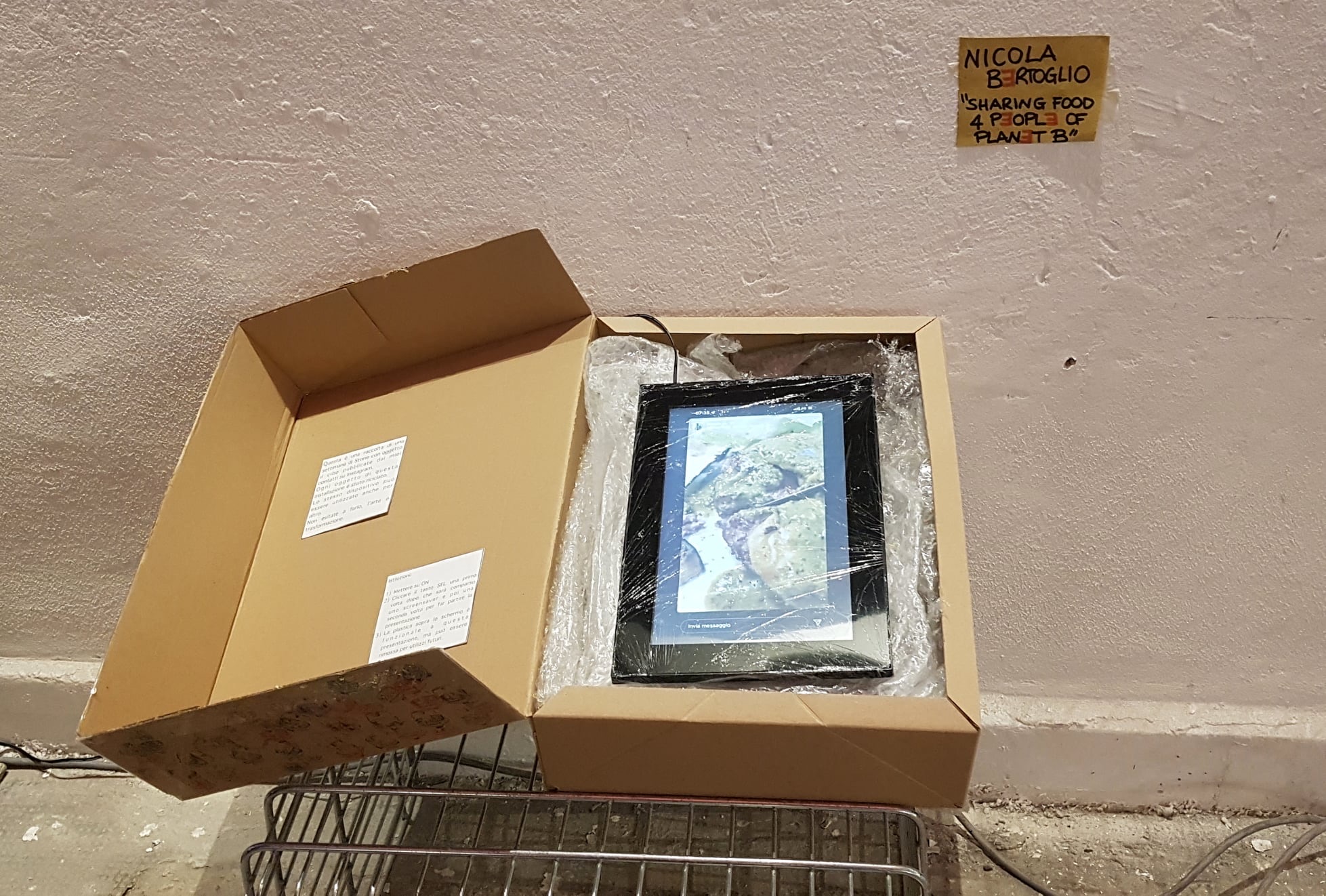 "Per una settimana ho raccolto tra i miei contatti di Instagram le Storie con protagonista il cibo e le ho inserite in vecchia cornice digitale avvolta da una pellicola di plastica. Ho spedito il tutto agli amici di Ri Cre AzionƎ in una scatola riciclata assieme alle istruzioni e alla descrizione del contenuto. La cornice stessa può essere riciclata per altre installazioni. Perché tutto ciò? Perché sul Pianeta B il cibo scarseggia e possiamo solo condividere le Storie di una passata era di ostentata abbondanza. Godiamoci allora questi pranzi e queste cene digitali finché durano perché le Storie scadono molto in fretta”.