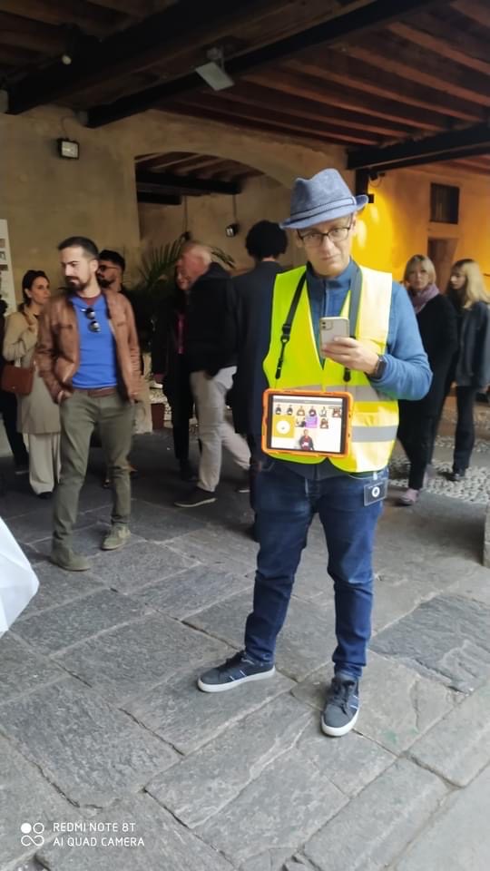 L’artista sarà ben visibile con il suo iconico gilet giallo con la scritta @RTWORK (“arte al lavoro”) e un iPad appeso al collo sul quale verranno trasmessi in tempo “reale” i ritratti da lui realizzati.