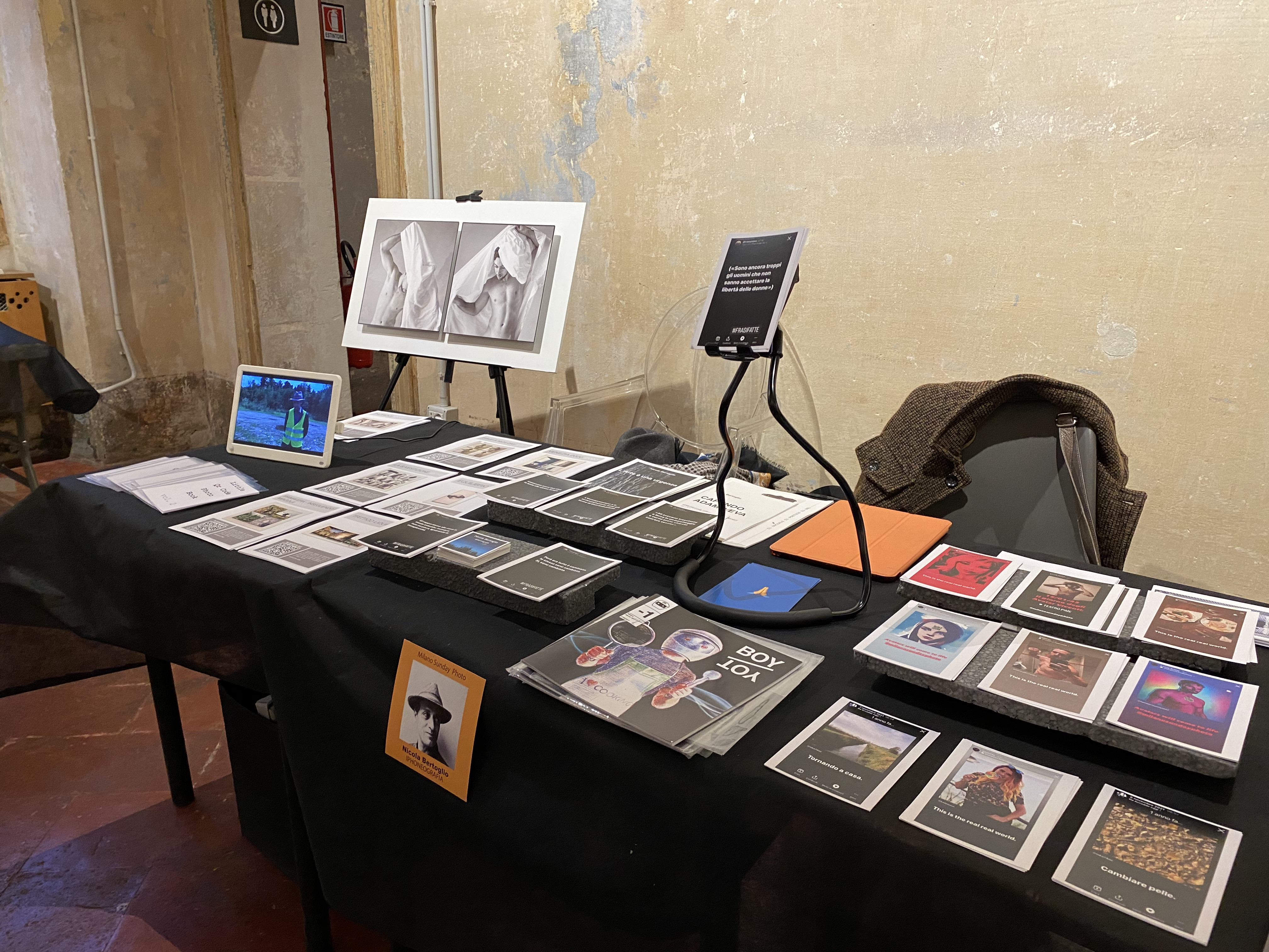 Questa invece la postazione di Bertoglio durante l’evento, con in mostra un’opera della serie “Panneggi” e alcune sue pubblicazioni autoprodotte tra cui le cartoline della serie “Frasi Fatte”: