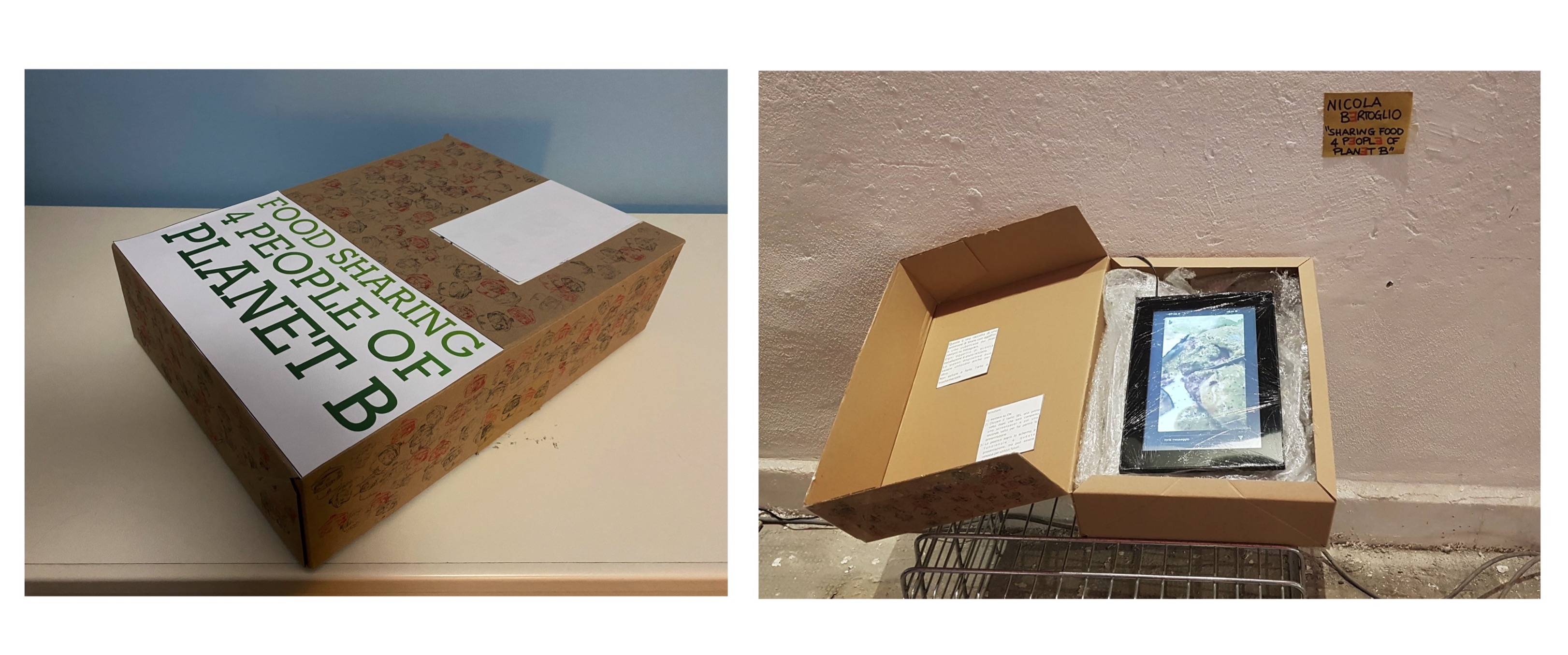 Food Sharing 4 People of Planet B / Ideata nel: 2021 / Materiali: scatola di cartone riciclata contenente una cornice digitale con una scheda SD con immagini di storie di Instagram / COLLETTIVO DADABOOM