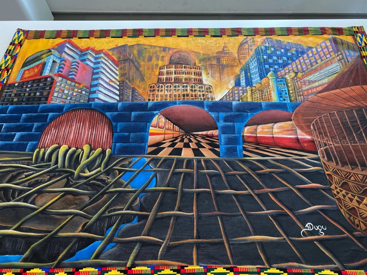 A philanthropist and v’abstract self-taught artist living in Kampala the capital of Uganda Godfrey Sserugunda creates paintings that excite and spark conversions about current state of social and Geo-political situations. He employs use of artificial objects in perspective view to envision the future with reference to the past.