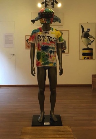 Può essere definita questa una scultura “mash-up” in quanto combina elementi di due artisti diametralmente opposti anche dal punto di vista anagrafico. Nicola Bertoglio, un fotografo iper-contemporaneo e Andrew Tosh, un giovane pittore neo-pop, si sono incontrati a Chiavari nel febbraio del 2018 per realizzare una performance di live-painting e live-photography durante la quale Tosh ha dipinto in tempo reale un attore con indosso una maglietta bianca e l’iconica maschera di Boy/Toy del medesimo progetto di Bertoglio. Le foto sono state fissate su Instagram con l’hashtag #boytosh0218 Successivamente Nicola Bertoglio, recuperando un vecchio manichino di abbigliamento, ha realizzato la scultura recante alla base un qr-code con il link della performance su Instagram. Questo ibrido “umano”/robot è la perfetta sintesi del processo creativo che ha fatto incontrare i due artisti in un unico atto performativo.