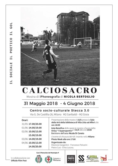 L’artista iPhoneografo Nicola Bertoglio ha da alcuni anni iniziato a seguire e fotografare squadre di calcio dilettantistico della periferia di Milano, cercando di rappresentare la sovrapposizione tra la dimensione popolare e globalmente nota dell’esperienza calcistica a quella alta e trascendentale dell’esperienza del Sacro. La mostra sarà composta da una serie di undici opere costituite da particolari accostamenti di fotografie realizzate con l'iPhone, per un totale di più di 40 immagini, stampate su lastre di alluminio chromaluxe e montate su supporto ligneo. Ogni opera sarà accompagnata da una estensione sonora con le registrazioni dal vivo delle voci e dei rumori di alcune delle partite fotografate dall’artista.