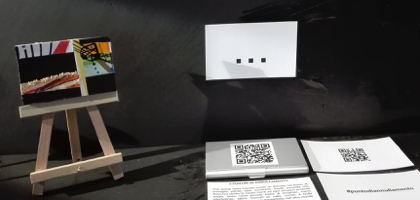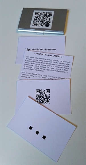 Micro installazione dal titolo “3 Puntini di Annullamento” composta da 4 fogli di carta delle dimensioni di un biglietto da visita comprendenti una grafica con 3 puntini, un qr code collegato ad un video composto da 3 micro video della serie #Puntodi Annullamento, un testo esplicativo e l’hashtag del progetto. Tutto quanto racchiuso in una piccola scatola recante il qr code del sito web dell’autore. L’opera è un pezzo unico donato a Vittore Baroni per questo evento. “Con questi video intendo creare un disturbo nel flusso di immagini, parole, idee, commenti, insulti, oscenità che fluiscono dentro le nostre menti ad ogni accesso ai social media. Sono come piccole pietre di inciampo, micro interferenze, attimi ricercati di nulla, contro il Nulla Dominante. Li potete trovare dappertutto nell’altro mondo virtuale. Buona interferenza.