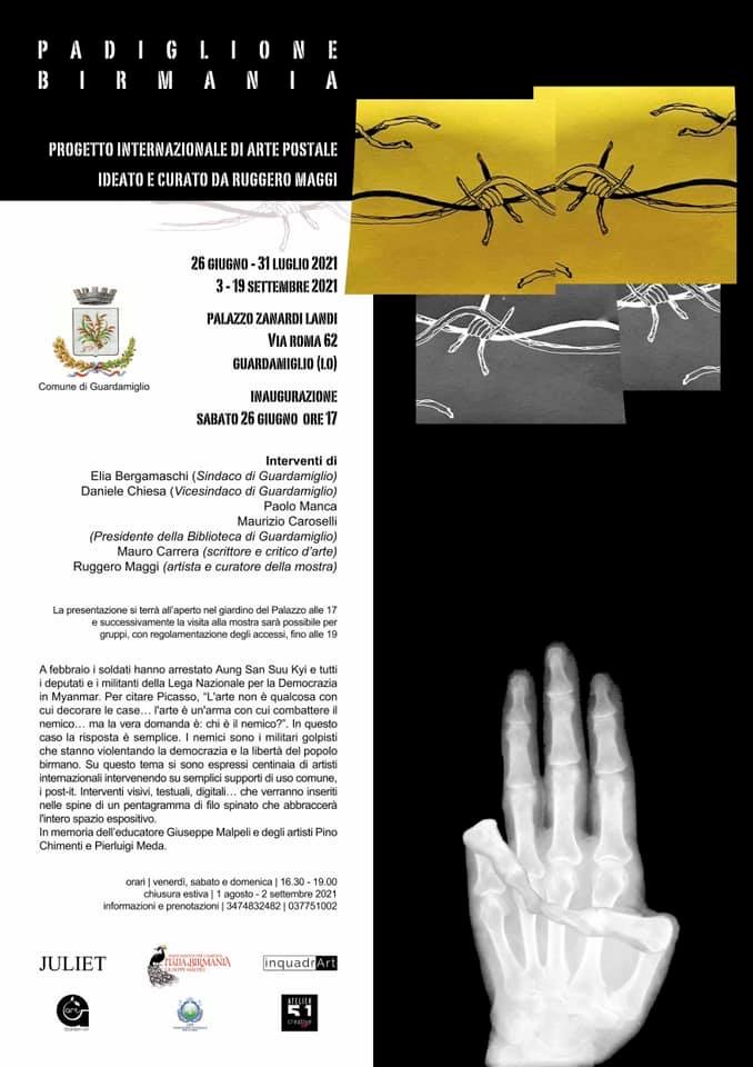 Il progetto internazionale di arte postale Padiglione Birmania ideato e curato da Ruggero Maggi, verrà presentato a Palazzo Zanardi Landi di Guardamiglio (LO) dal 26 giugno al 31 luglio 2021 e, dopo la chiusura estiva, dal 3 al 19 settembre 2021.L'inaugurazione è prevista sabato 26 giugno alle ore 17 con gli interventi di Elia Bergamaschi Sindaco di Guardamiglio, di Daniele Chiesa Vicesindaco di Guardamiglio, di Paolo Manca, di Maurizio Caroselli Presidente della Biblioteca di Guardamiglio, di Mauro Carrera, scrittore e critico d’arte e Ruggero Maggi artista e curatore della mostra. La presentazione si terrà all'aperto nel giardino del Palazzo alle ore 17 e successivamente la visita alla mostra sarà possibile per gruppi, con regolamentazione degli accessi, fino alle 19.